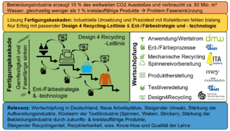 Das Gesamtziel des FuE Verbundvorhabens SustainTex ist eine Fertigungskaskade zur Maximierung der Nutzungsdauer von Primärfasern über mehrere Produktlebenszyklen hinweg.
